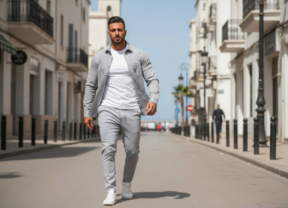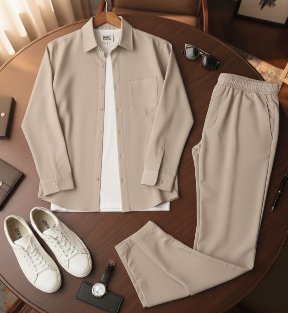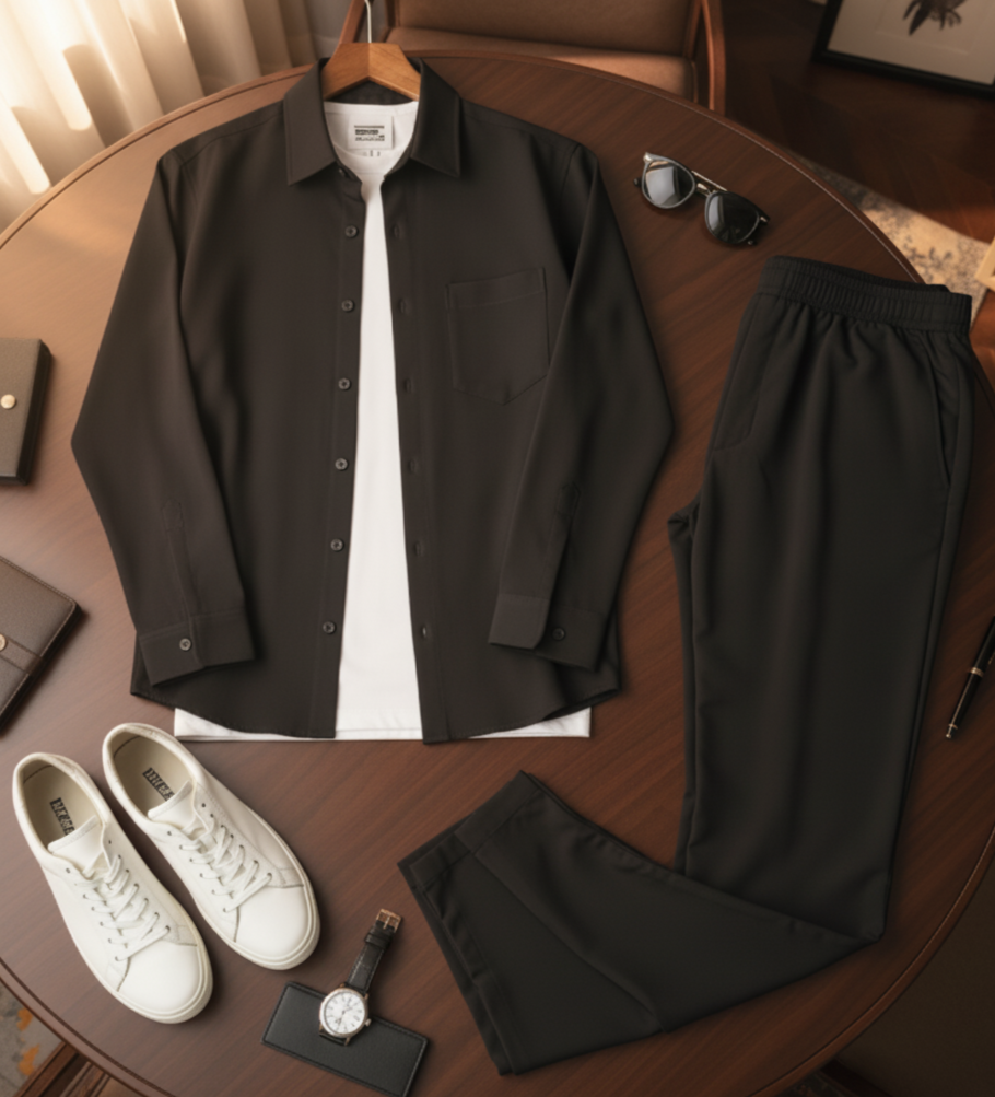قميص بستايل عصري، سروال خفيف و مريح، و تيشيرت أبيض ناعم يكمّل الإطلالة ديالك 🔥